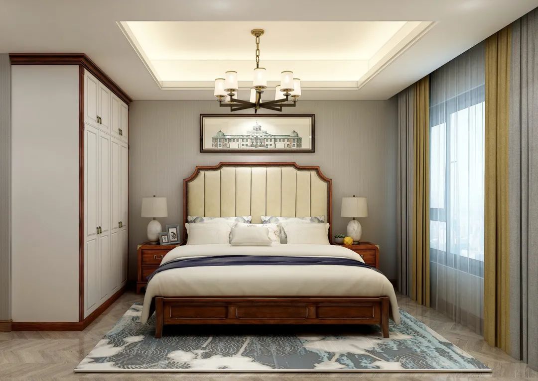 优雅沉静的雾霾蓝床架,干净利索的线条设计,天然的皮革纹路,与原木色的墙面相呼应,纯粹、朴实,营造出轻奢简约的氛围,满足了屋主对空间的无限畅想。