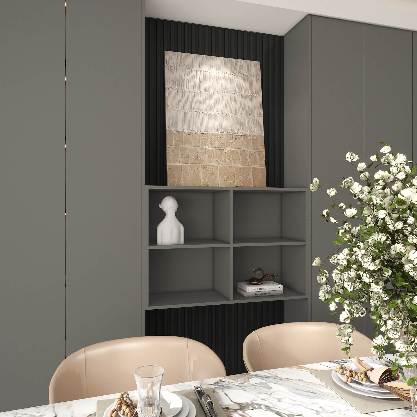 大面积运用深灰色,格栅元素极具设计感,在层板灯的渲染下整个玄关轻奢有内涵,给空间增添了几分自然纯粹的气息,让人身心放松。
