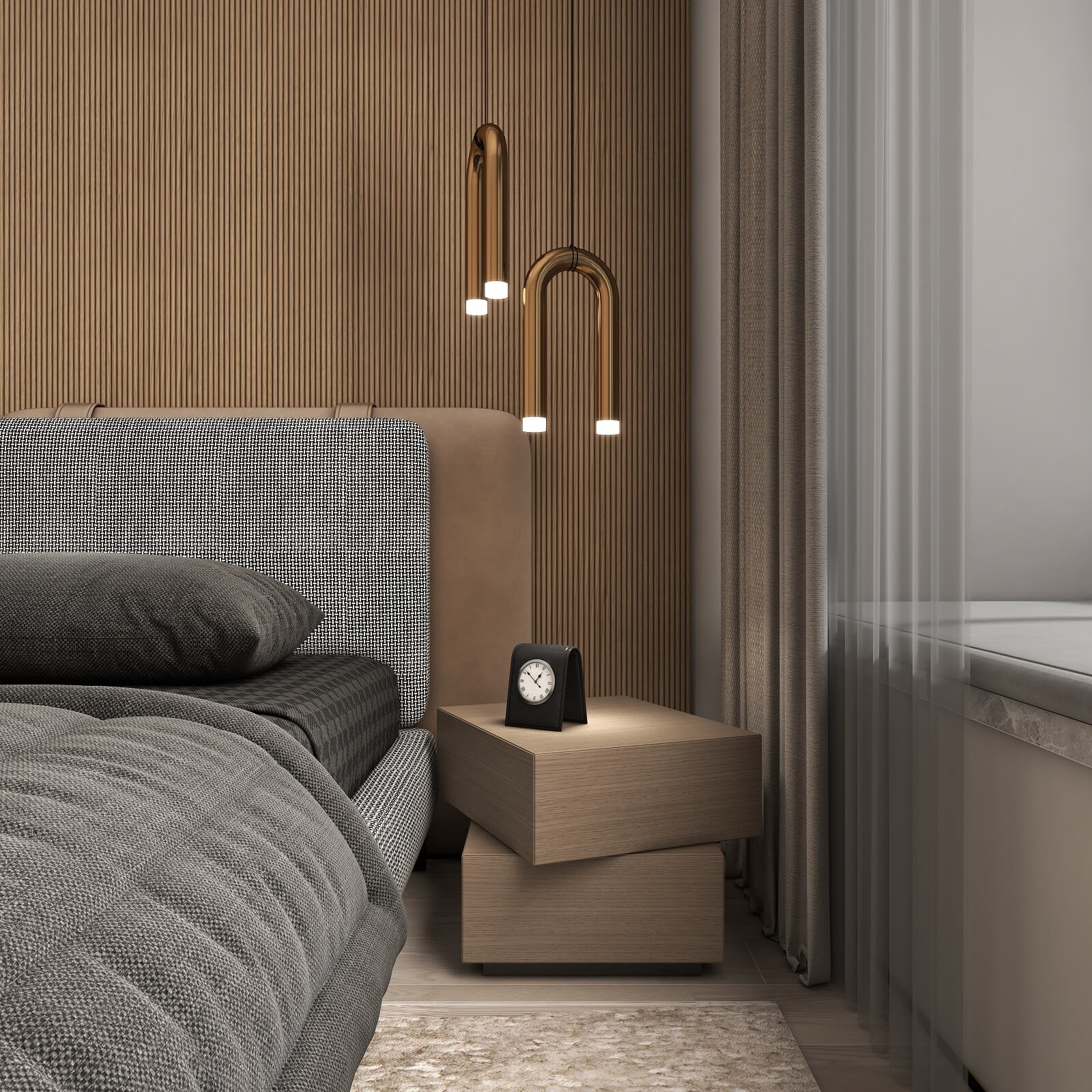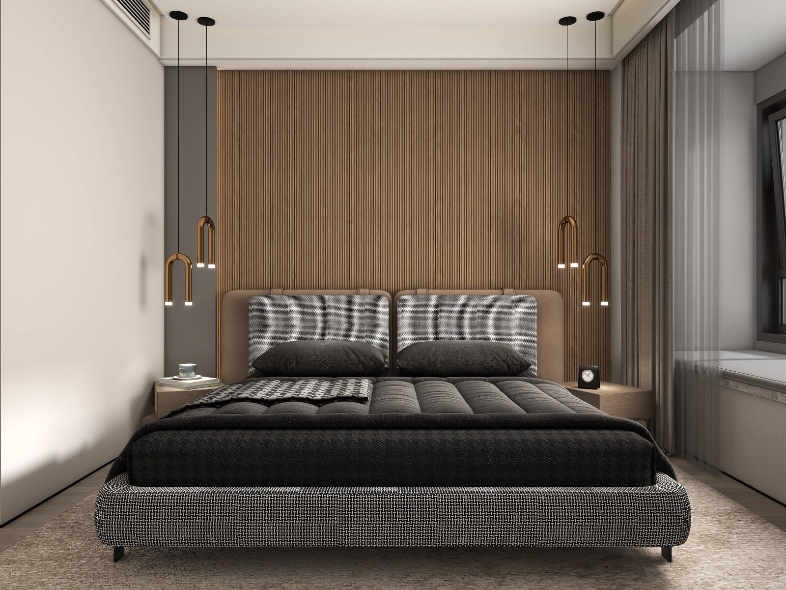 主卧的一切设计,都有助于睡眠氛围的营造,黑棕色配合沉静的物件,从材料到触感,强调事物质朴的内在,能够展示高端定制木作的本质之美。
